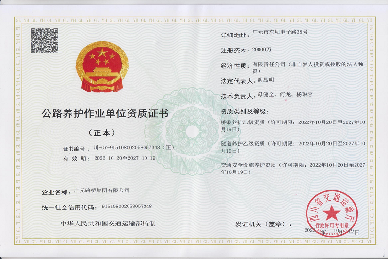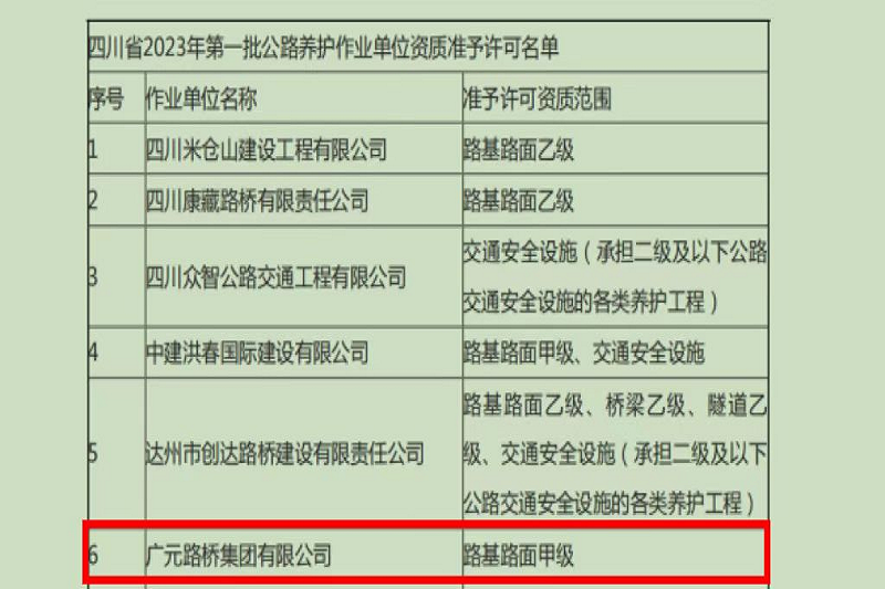 再添喜報!2023年2月16日,四川省交通運(yùn)輸廳官網(wǎng)公布了《四川省2023年第一批公路養(yǎng)護(hù)作業(yè)單位資質(zhì)準(zhǔn)予許可名單》,廣元路橋集團(tuán)有限公司位列其中。至此,廣元路橋集團(tuán)有限公司成功獲得路基路面甲級、橋梁乙級、交通安全設(shè)施、隧道乙級4項公路養(yǎng)護(hù)作業(yè)資質(zhì),成為我市第一家、也是唯一一家取得上述公路養(yǎng)護(hù)作業(yè)資質(zhì)的市屬國有企業(yè)。